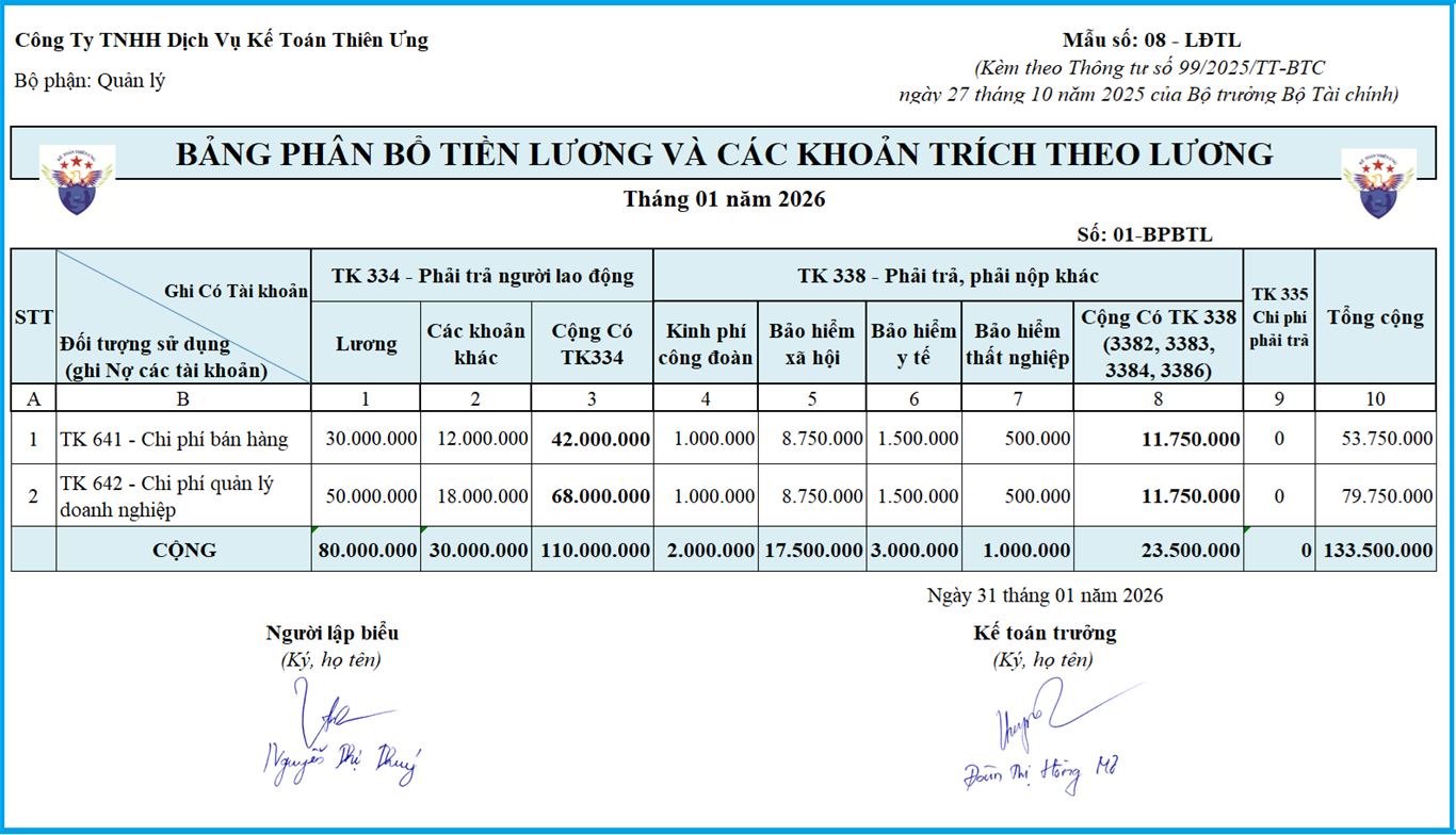 Bắt đầu từ ngày 01/01/2026, khi thực hiện phân bổ tiền lương và các khoản trích theo lương thì doanh nghiệp sẽ sử dụng Mẫu số: 08 – LĐTL được ban hành kèm theo Thông tư 99/2025/TT-BTC thay choMẫu số: 11-LĐTLban hành kèm theo Thông tư số 200