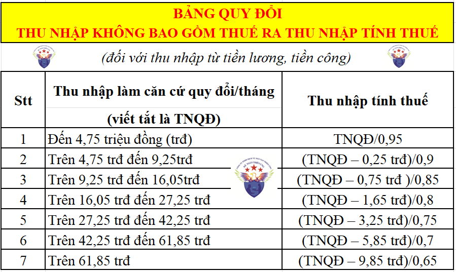 Bảng quy đổi thu nhập không bao gồm thuế ra thu nhập tính thuế