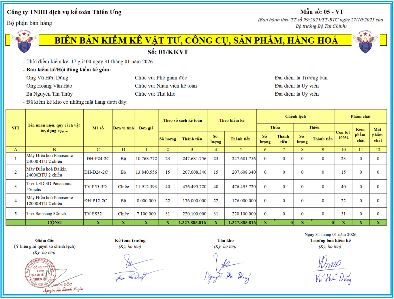 Sau khi lập xong biên bản, giám đốc, trưởng ban/chủ tịch hội đồng kiểm kê và thủ kho, kế toán trưởng cùng ký vào biên bản (ghi rõ họ tên).