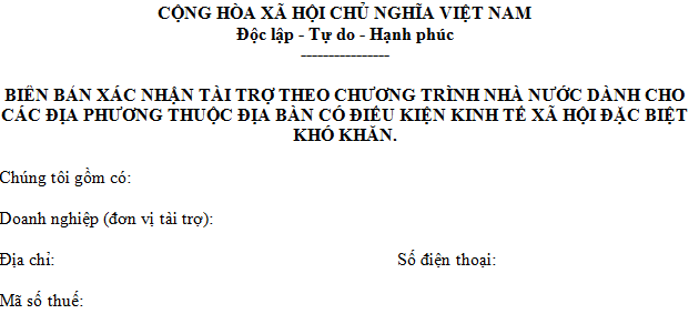 BIÊN BẢN XÁC NHẬN TÀI TRỢ THEO CHƯƠNG TRÌNH NHÀ NƯỚC DÀNH CHO CÁC ĐỊA PHƯƠNG THUỘC ĐỊA BÀN CÓ ĐIỀU KIỆN KINH TẾ XÃ HỘI ĐẶC BIỆT KHÓ KHĂN.