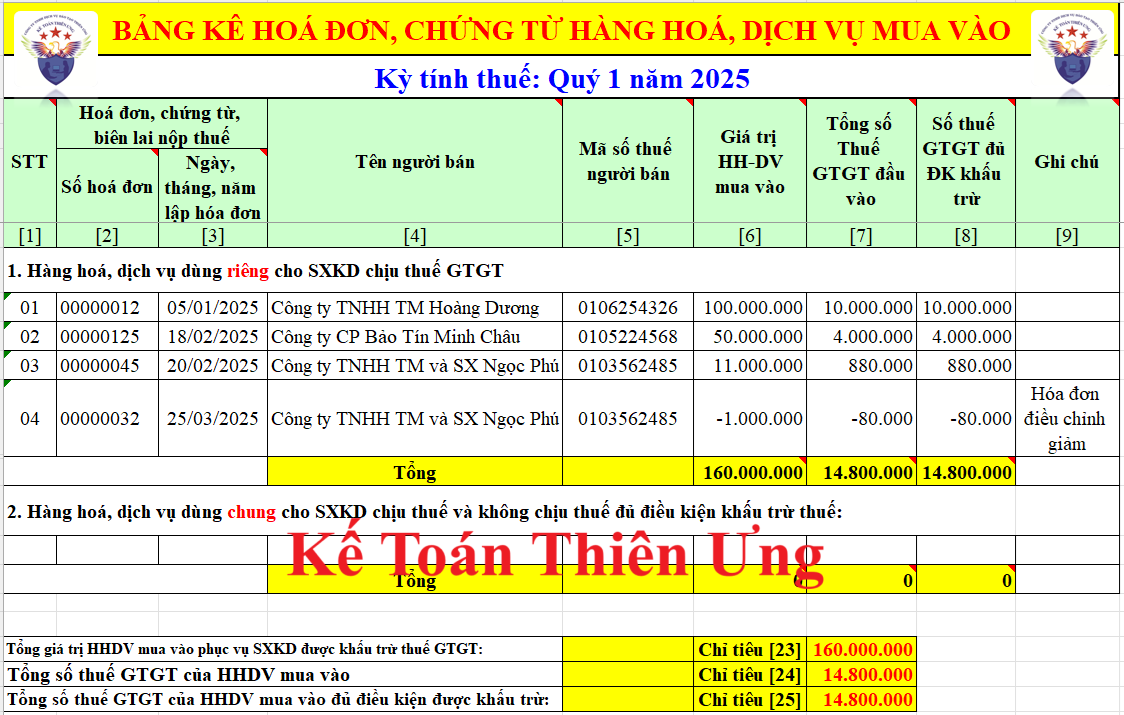 Ví dụ: Qúy 3/2025 Công ty Thiên Ưng có 1 hóa đơn GTGT đầu vào trị giá 30.000.000đ (chưa thuế 10%), thuế GTGT 10% là 3.000.000đ