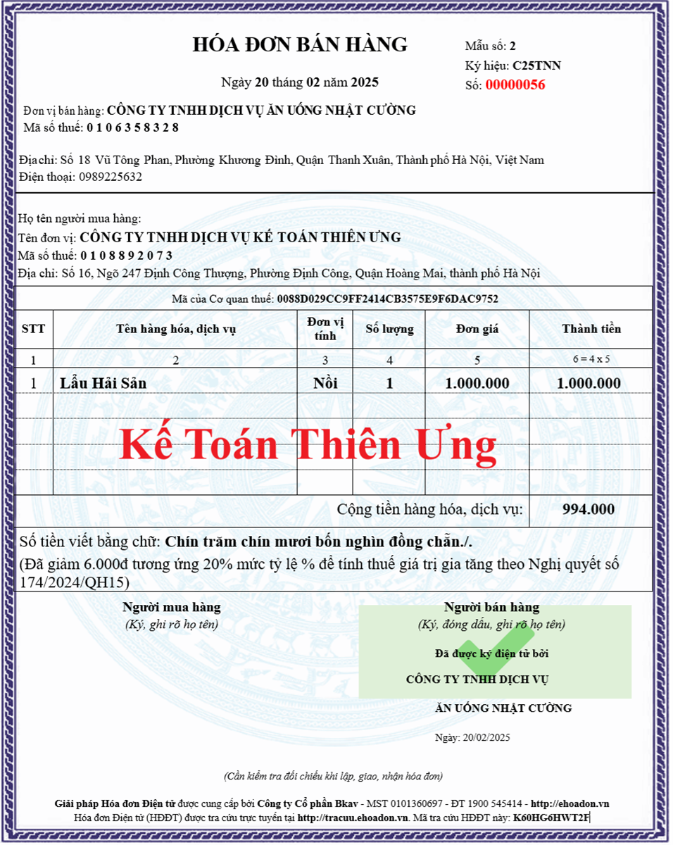 + Đồng thời ghi chú: “đã giảm 6.000đ tương ứng 20% mức tỷ lệ % để tính thuế giá trị gia tăng theo Nghị quyết số 174/2024/QH15”.