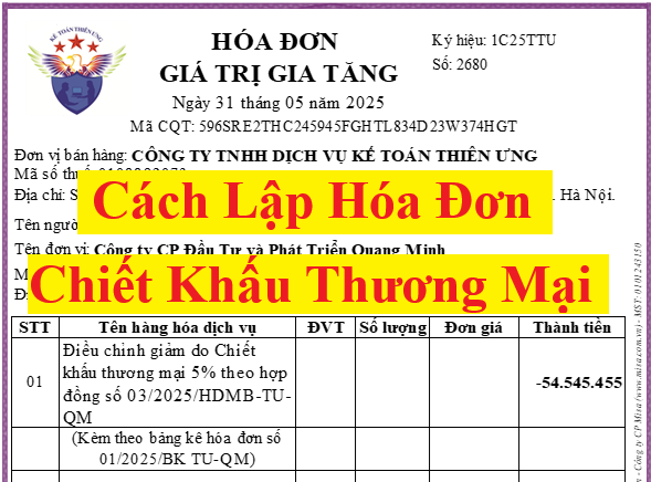 => Công ty Thiên Ưng lập Hoá đơn thực hiện ngay Chiết khấu Thương mại cho Công ty Minh Tú tại lần mua cuối cùng này như sau:
