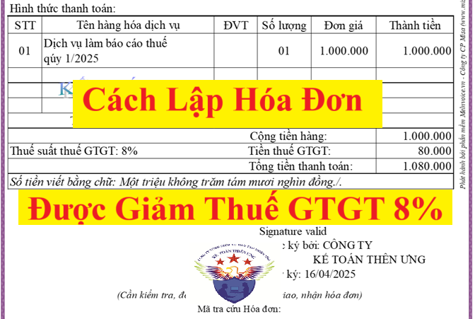 Ngày 16/4/2025, có phát sinh việc cung cấp dịch vụ làm báo cáo thuế qúy 1/2025 cho công ty Bảo An như sau: