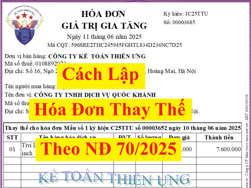 1.2. Tình huống phát sinh để hướng dẫn lập hóa đơn thay thế – Ngày 10/06/2025, Công ty Kế Toán Thiên Ưng bán Tivi cho công ty Quốc Khánh