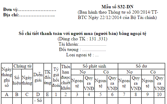 Hướng dẫn cách lập Sổ chi tiết thanh toán với người mua (người bán) bằng ngoại tệ Mẫu S32- DN theoThông tư 200/2014/TT-BTC, mục đích lập, căn cứ và phương pháp ghi sổ chi tiết từng cột.