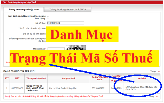 Mã trạng thái Tên trạng thái Thông tin chi tiết của MST Nội dung của trạng thái MST/Thông tin chi tiết của MST