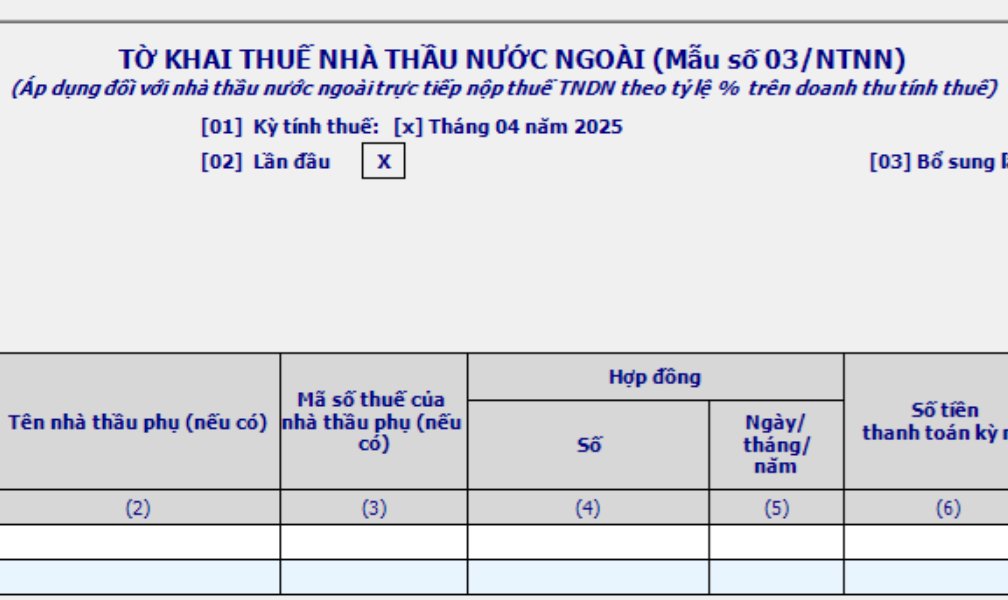 Mẫu 03/NTNN Tờ khai thuế nhà thầu nước ngoài trên phần mềm HTKK: