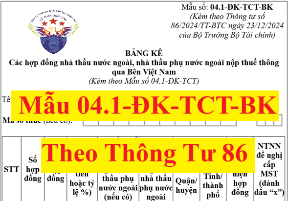 Mẫu 04.1-ĐK-TCT-BK theo Thông tư số 86/2024/TT-BTC là bảng kê các hợp đồng nhà thầu nước ngoài, nhà thầu phụ nước ngoài nộp thuế thông qua Bên Việt Nam (Kèm theo Mẫu số 04.1-ĐK-TCT)
