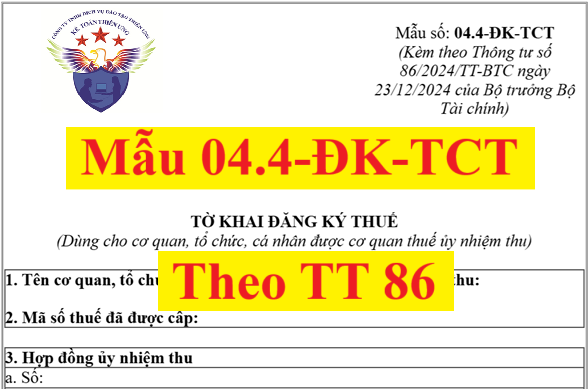 Mẫu số: 04.4-ĐK-TCT theo Thông tư số 86/2024/TT-BTC tờ khai đăng ký thuế dùng cho cơ quan, tổ chức, cá nhân được cơ quan thuế ủy nhiệm thu