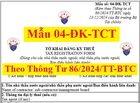 + Từ ngày 06/02/2025 trở đi, kể từ khi Thông tư số 86/2024/TT-BTC có hiệu lực thì Khi đăng ký thuế cho các nhà thầu nước ngoài, nhà thầu phụ nước ngoài, Ban điều hành liên danh sẽ sử dụng mẫu 04-ĐK-TCT ban hành kèm theo Thông tư số 86/2024/TT-BTC ngày 23/12/2024 của Bộ trưởng Bộ Tài chính