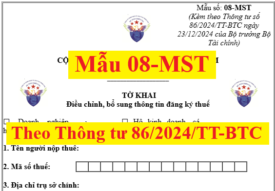 | Bắt đầu từ ngày 06/02/2025 trở đi, tức là kể từ ngày thông tư Thông tư số 86/2024/TT-BTC ngày 23/12/2024 của Bộ trưởng Bộ Tài chính có hiệu lực thì khi làm tờ khai điều chỉnh, bổ sung thông tin đăng ký thuế sẽ sử dụng Mẫu 08-MST được ban hành kèm theo thông tư 86/2024/TT-BTC (thay thế Mẫu 08-MST của Thông tư 105/2020/TT-BTC)