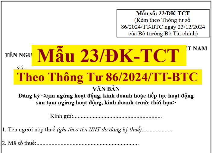 Mẫu 23/ĐK-TCT theo thông tư 86/2024/TT-BTC là văn bản đăng ký tạm ngừng hoạt động, kinh doanh hoặc tiếp tục hoạt động sau tạm ngừng hoạt động, kinh doanh trước thời hạn