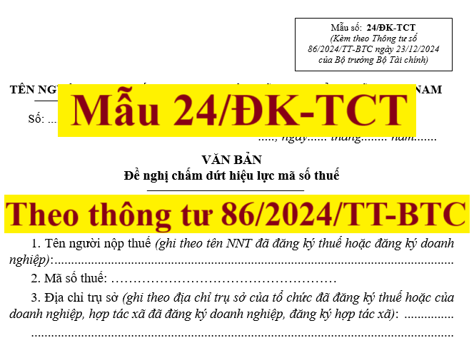 Mẫu 24/ĐK-TCT theo thông tư 86/2024/TT-BTC là văn bản đề nghị chấm dứt hiệu lực mã số thuế