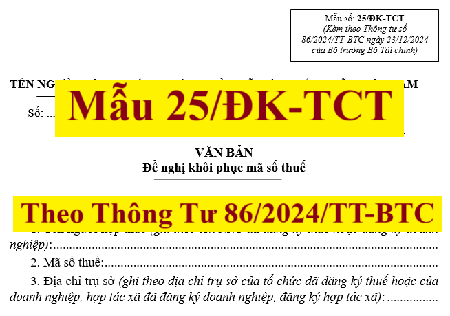 Mẫu 25/ĐK-TCT theo Thông tư 86/2024/TT-BTC là mẫu văn bản đề nghị khôi phục mã số thuế