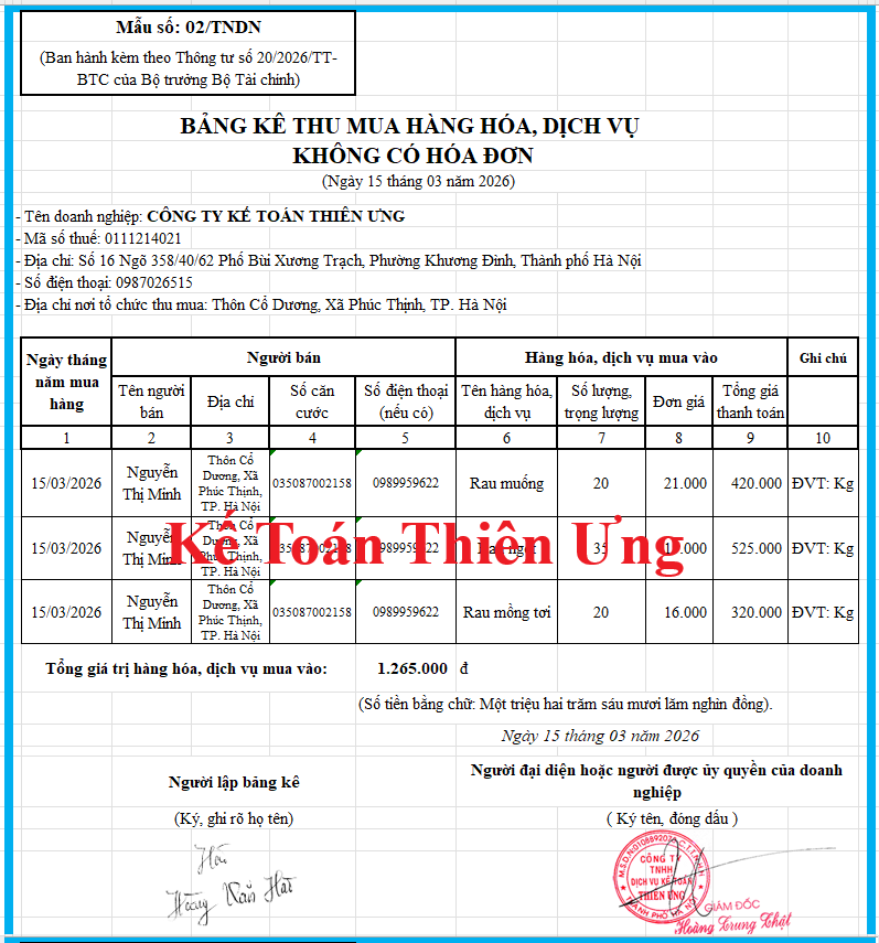+ Bảng kê thu mua hàng hóa, dịch vụ theo Mẫu số 02/TNDN ban hành kèm theo Thông tư 20/2026/TT-BTC do người đại diện theo pháp luật hoặc người được ủy quyền của doanh nghiệp ký và chịu trách nhiệm;