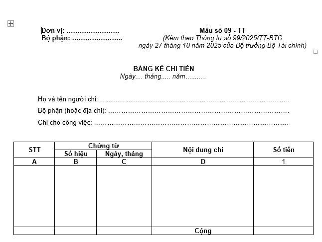 Mẫu bảng kê chi tiền mới nhất năm 2026 là Mẫu số: 09 – TT được ban hành kèm theo Thông tư số 99/2025/TT-BTC có hiệu lực từ ngày 01/01/2026 (Thay thế cho mẫu 09 – TT theo Thông tư 200)