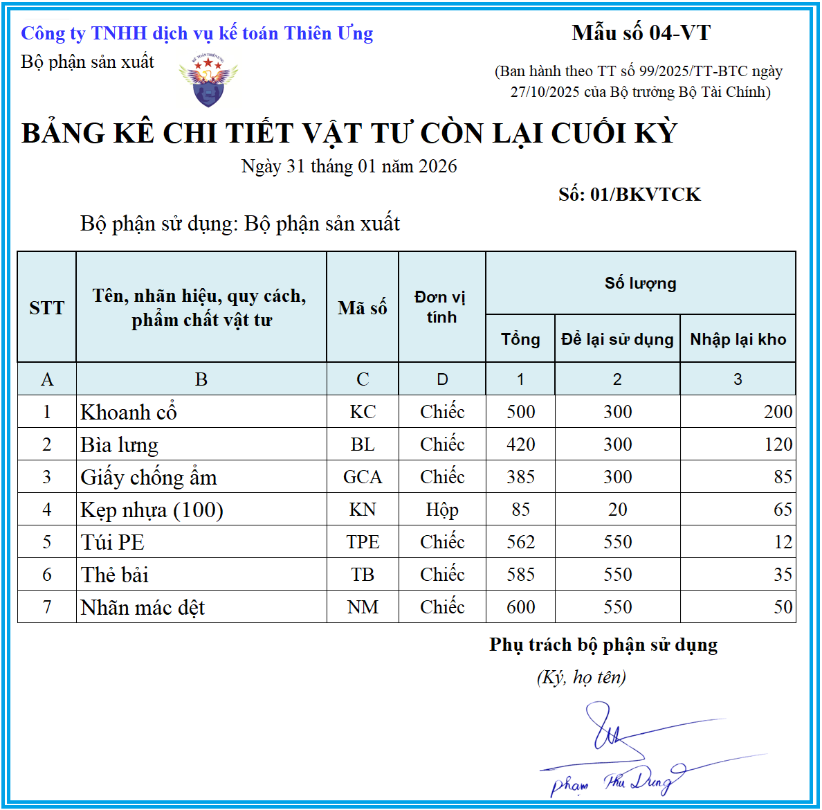 – Nếu vật tư còn sử dụng tiếp thì bộ phận sử dụng lập Bảng kê chi tiết vật tư còn lại cuối kỳ thành 2 bản.