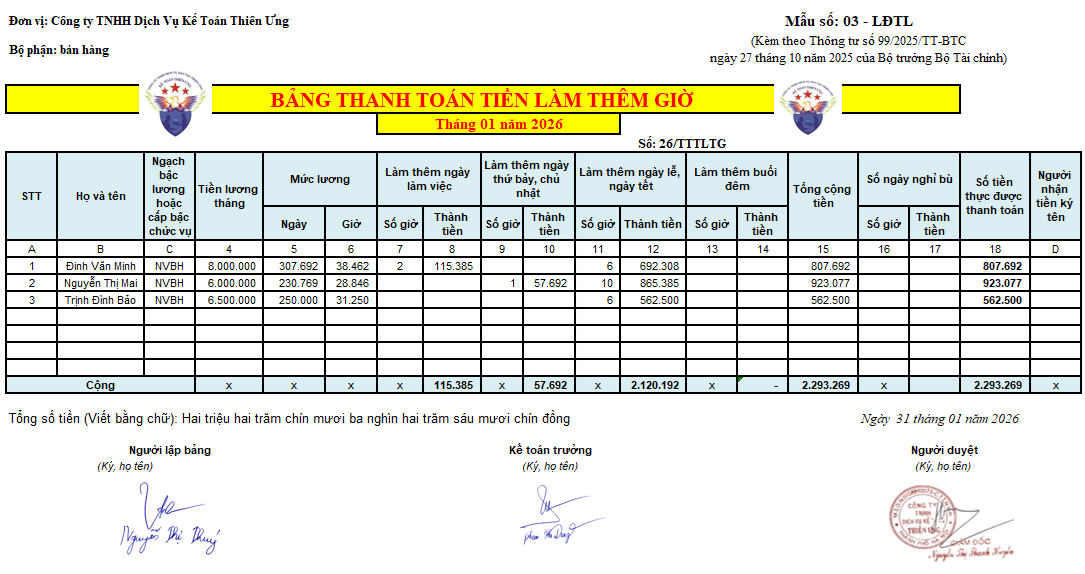 Mẫu bảng thanh toán tền làm thêm giờ theo Thông tư 99