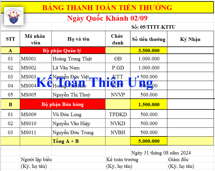 Bảng thanh toán tiền thưởng do phòng kế toán lập theo từng bộ phận và phải có chữ ký (họ tên) của người lập, kế toán trưởng và giám đốc.