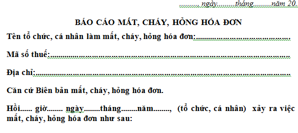 Hồi…… giờ…….. ngày……..tháng……..năm…….., (tổ chức, cá nhân) xảy ra việc mất, cháy, hỏng hóa đơn như sau: