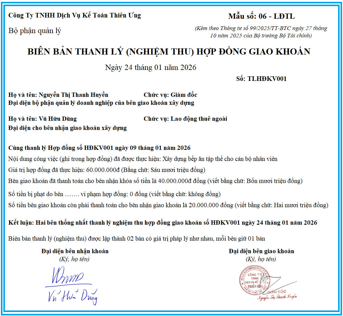 Mẫu Biên bản thanh lý hợp đồng giao khoán mới nhất năm 2026 là Mẫu số: 06 – LĐTL được ban hành kèm theo Thông tư số 99/2025/TT-BTC có hiệu lực sử dụng từ ngày 01/01/2026 (Thay thế cho Mẫu 09 – LĐTL của Thông tư 200/2014/TT-BTC)