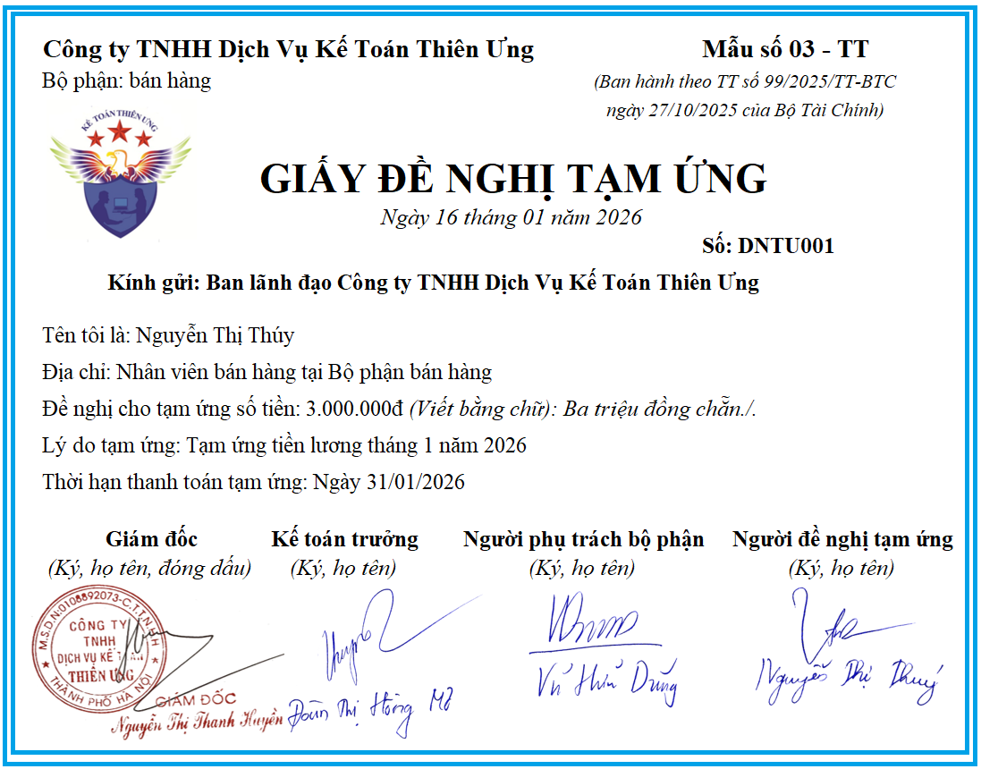 Mẫu giấy đề nghị tạm ứng theo Thông tư số 99/2025/TT-BTC có số hiệu là: Mẫu số 03 –TT(Mẫu này có giá trị sử dụng bắt đầu từ ngày 01/01/2026, thay thế cho Mẫu số 03 – TT được ban hành kèm theo Thông tư 200)
