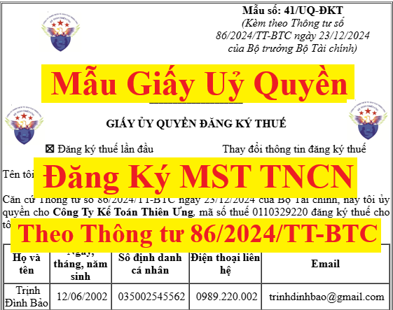 Bắt đầu từ ngày 06/02/2025 trở đi, tức là kể từ khi Thông tư số 86/2024/TT-BTC có hiệu lực thì khi thực hiện làm giấy ủy quyền đăng ký mã số thuế TNCN thì sẽ sửi dụng Mẫu số: 41/UQ-ĐKT ban hành kèm theo Thông tư số 86/2024/TT-BTC ngày 23/12/2024 của Bộ trưởng Bộ Tài chính
