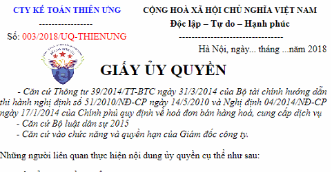 mẫu giấy uỷ quyền ký hoá đơn GTGT