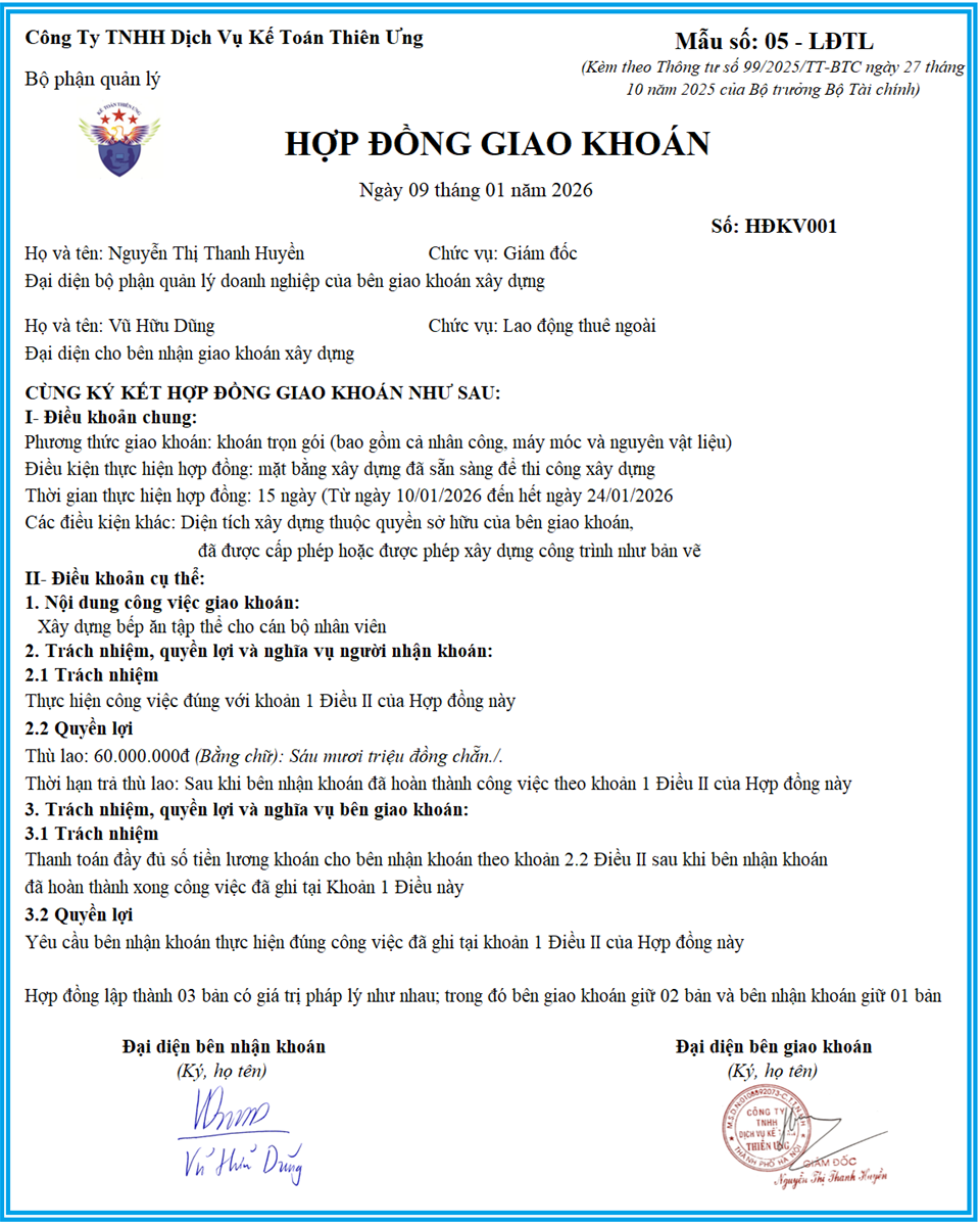 Mẫu hợp đồng giao khoán theo thông tư 99 mới nhất 2026