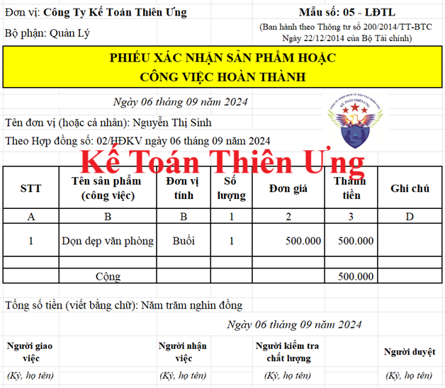 Mẫu số: 05 – LĐTL phiếu xác nhận sản phẩm, công việc hoàn thành được ban hành kèm theo thông tư 200 và thông tư 133: là mẫu chứng từ hướng dẫn (không phải là mẫu bắt buộc)