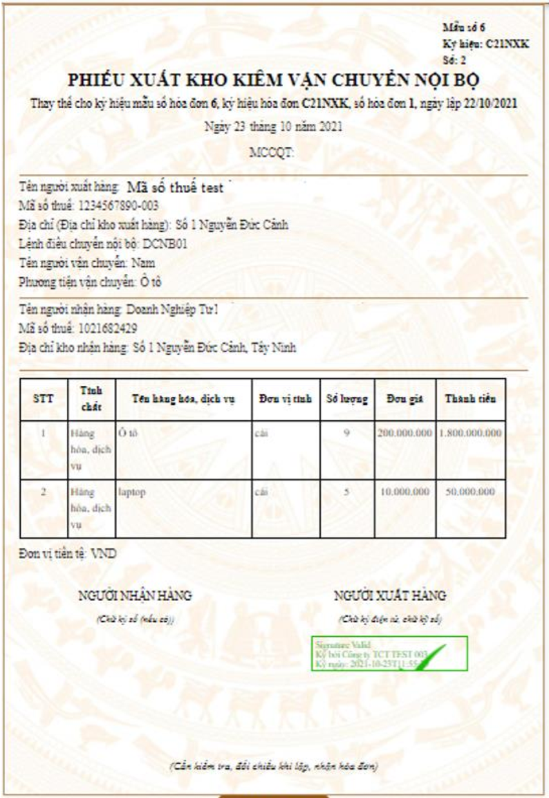 1. Mẫu phiếu xuất kho kiêm vận chuyển nội bộ điện tử theo Nghị định 123/2020/NĐ-CP