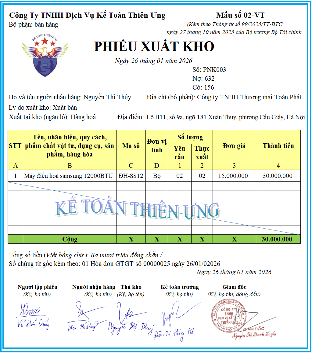 Mẫu số: 02 – VT được ban hành kèm theo phụ lục II của Thông tư 99/2025/TT-BTC là mẫu phiếu xuất kho mới nhất năm 2026 (Mẫu này được sử dụng từ ngày 01/01/2026, thay cho mẫu phiếu xuất kho 02 -VT được ban hành kèm theo Thông tư 200)