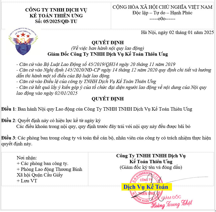 Dưới đây, công ty đào tạoKế Toán Thiên Ưng xin được cung cấp cho các bạn tham khảo Mẫu quyết định ban hành nội quy lao động năm 2025 mới nhất