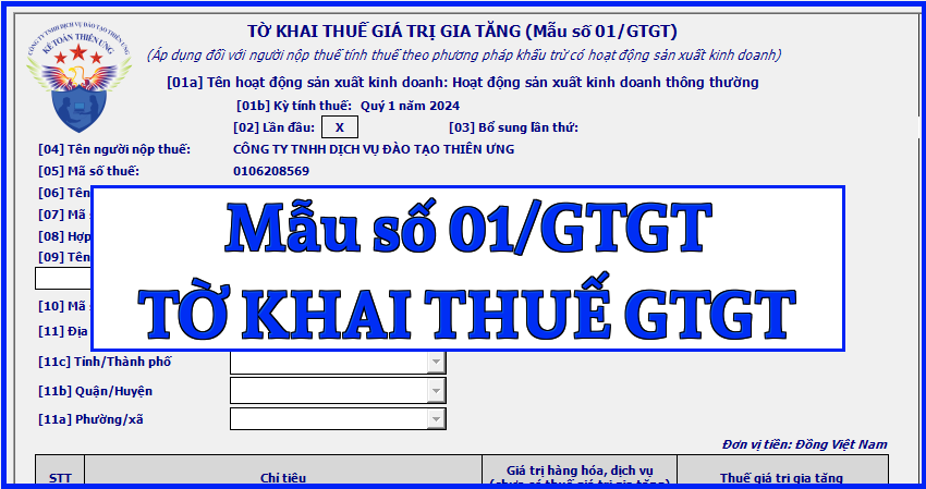 CỘNG HÒA XÃ HỘI CHỦ NGHĨA VIỆT NAM Độc lập – Tự do – Hạnh phúc TỜ KHAI THUẾ GIÁ TRỊ GIA TĂNG (Áp dụng đối với người nộp thuế tính thuế theo phương pháp khấu trừ có hoạt động sản xuất kinh doanh) [01a] Tên hoạt động sản xuất kinh doanh: …… [01b] Kỳ tính thuế: Tháng … năm … /Quý … năm …