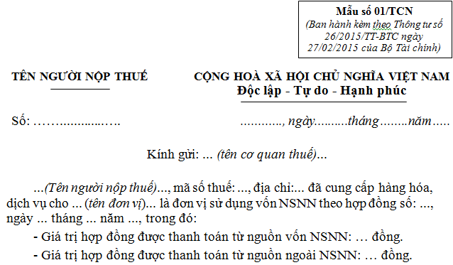 Đơn xác nhận chưa được thanh toán Mẫu 01/TCN theo Thông tư 26/2015/TT-BTC ngày 27/02/2015 của Bộ Tài chính.