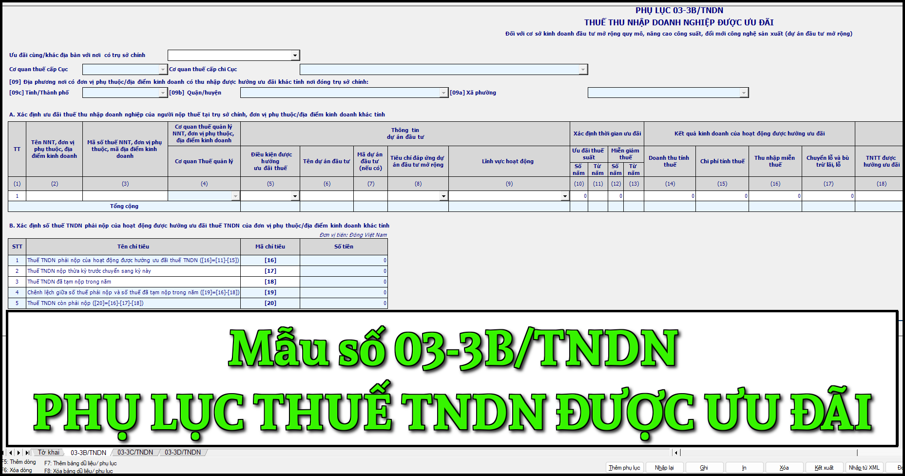 – Trường hợp NNT kê khai riêng Phụ lục thuế thu nhập doanh nghiệp được ưu đãi mẫu 03-3B/TNDN tại cơ quan thuế nơi NNT có đơn vị phụ thuộc, địa điểm kinh doanh khác tỉnh có thu nhập được hưởng ưu đãi thuế TNDN, NNT ghi rõ kỳ tính thuế năm (theo năm dương lịch hoặc năm tài chính đối với doanh nghiệp áp dụng năm tài chính khác với năm dương lịch), từ ngày đầu tiên của năm dương lịch/năm tài chính hoặc ngày bắt đầu hoạt động kinh doanh (đối với doanh nghiệp mới thành lập) hoặc ngày hợp đồng bắt đầu có hiệu lực (đối với hợp đồng) đến ngày kết thúc năm dương lịch/năm tài chính hoặc ngày chấm dứt hoạt động kinh doanh hoặc chấm dứt hợp đồng hoặc chuyển đổi hình thức sở hữu doanh nghiệp hoặc tổ chức lại doanh nghiệp được xác định phù hợp với kỳ kế toán theo quy định của pháp luật về kế toán.
