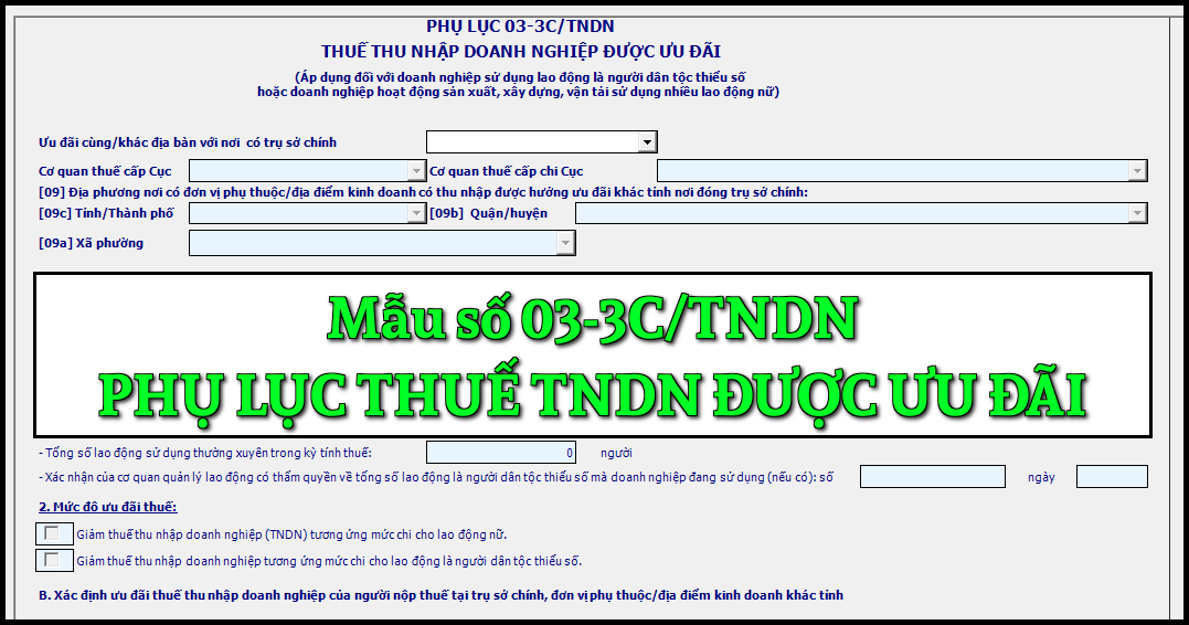 Phụ lục THUẾ THU NHẬP DOANH NGHIỆP ĐƯỢC ƯU ĐÃI (Áp dụng đối với doanh nghiệp sử dụng lao động là người dân tộc thiểu số hoặc doanh nghiệp hoạt động sản xuất, xây dựng, vận tải sử dụng nhiều lao động nữ) (Kê khai theo từng tỉnh nơi người nộp thuế có trụ sở chính, đơn vị phụ thuộc/địa điểm kinh doanh khác tỉnh có thu nhập được hưởng ưu đãi đồng thời nộp Phụ lục này kèm tờ khai quyết toán thuế thu nhập doanh nghiệp số 03/TNDN tại trụ sở chính ) [01]Kỳ tính thuế:……. Từ ……/ ……/ …… đến ……/ ……/ …… [02] Lần đầu [03] Bổ sung lần thứ:… [04]Tên người nộp thuế: ………………………………………………………………………… [05] Mã số thuế: [06] Tên đại lý thuế (nếu có):…………………………………………………………………….. [07] Mã số thuế: [08] Hợp đồng đại lý thuế: Số…………………………..ngày………………………………….. [09] Địa phương nơi có đơn vị phụ thuộc/địa điểm kinh doanh có thu nhập được hưởng ưu đãi khác tỉnh nơi đóng trụ sở chính: [09a]Phường/xã …………… [09b]Quận/huyện……………..[09c]Tỉnh/Thành phố……… A. Xác định điều kiện và mức độ ưu đãi thuế: 1. Điều kiện ưu đãi: Doanh nghiệp hoạt động sản xuất, xây dựng, vận tải sử dụng nhiều lao động nữ: – Tổng số lao động sử dụng thường xuyên trong kỳ tính thuế:…………….người – Xác nhận của cơ quan quản lý lao động có thẩm quyền về tổng số lao động nữ mà doanh nghiệp đang sử dụng (nếu có): số………. ngày………….. Doanh nghiệp sử dụng lao động là người dân tộc thiểu số: – Tổng số lao động sử dụng thường xuyên trong kỳ tính thuế:…………….người – Xác nhận của cơ quan quản lý lao động có thẩm quyền về tổng số lao động là người dân tộc thiểu số mà doanh nghiệp đang sử dụng (nếu có): số……………………. ngày………….. 2. Mức độ ưu đãi thuế: Giảm thuế thu nhập doanh nghiệp (TNDN) tương ứng mức chi cho lao động nữ. Giảm thuế thu nhập doanh nghiệp tương ứng mức chi cho lao động là người dân tộc thiểu số. B.Xác định ưu đãi thuế thu nhập doanh nghiệp của người nộp thuế tại trụ sở chính, đơn vị phụ thuộc/địa điểm kinh doanh khác tỉnh Đơn vị tiền: Đồng Việt Nam