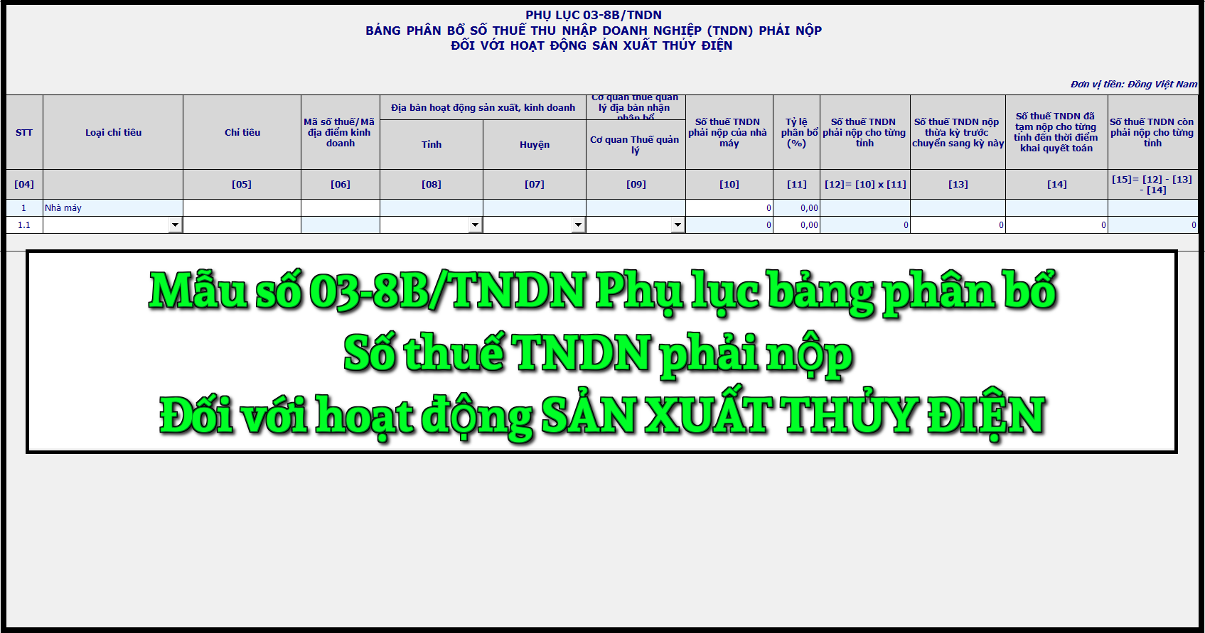 Cách kê khai Phụ lục bảng phân bổ số thuế thu nhập doanh nghiệp phải nộp đối với hoạt động sản xuất thủy điện – mẫu số 03-8B/TNDN theo TT 80/2021 như sau: