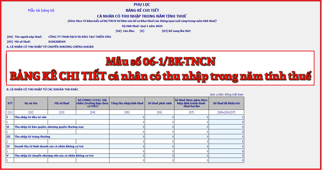 – Riêng đối với Công ty xổ số điện toán Việt Nam không kê khai chi tiết theo mục này mà kế khai Phụ lục bản phân bổ 05-1/PBT-KK-TNCN.