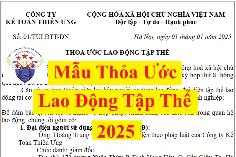 THOẢ ƯỚC LAO ĐỘNG TẬP THỂ Để đảm bảo quyền lợi và nghĩa vụ hợp pháp, chính đáng của mỗi bên trong quan hệ lao động, chúng tôi gồm có: Ông: Hoàng Trung Thật – Người đại diện theo pháp luật của Công ty Kế Toán Thiên Ưng Chức danh: giám đốc Địa chỉ: 173 đường Xuân Thủy, P. Dịch Vọng Hậu, Q. Cầu Giấy, Tp. Hà Nội