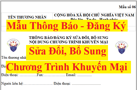 Cụ thể Mẫu số 06 –  Thông báo/đăng ký sửa đổi, bổ sung nội dung chương trình khuyến mại như sau: