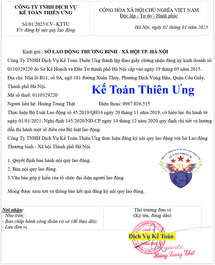 Công ty Kế Toán Thiên Ưng ở Hà Nội (Quận Hoàng Mai) thì sẽ đăng ký với Phòng Lao Động Thương Binh – Xã Hội của Quận nên trong công văn đề nghị đăng ký nội quy lao động đang ghi là: Phòng Lao Động Thương Binh – Xã Hội củaQuận Hoàng Mai.Còn công ty các bạn ở địa bàn khác đăng ký với SỞLao Động Thương Binh – Xã Hội của Tỉnh/Thành Phố thì các bạn ghi theo Sở và Tỉnh/Thành Phố đó