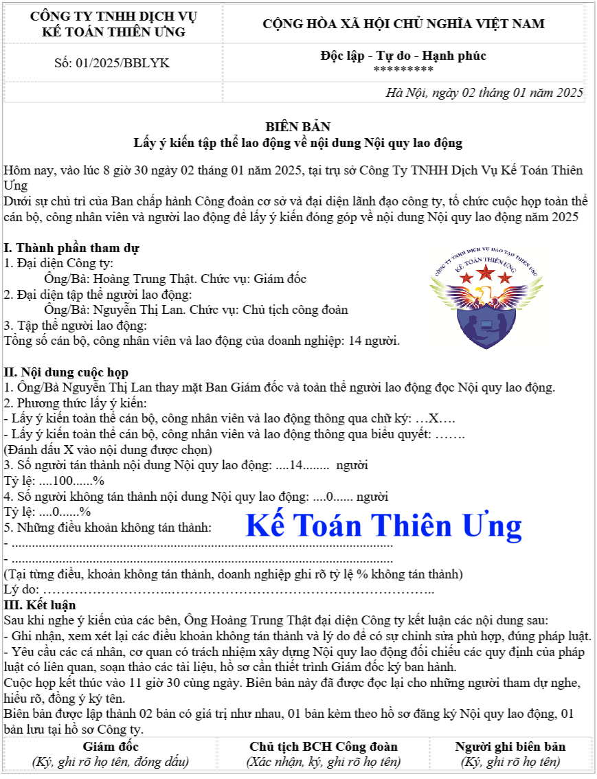 BIÊN BẢN GÓP Ý KIẾN Hôm nay, vào lúc……. giờ ……. phút, ngày …….. tháng ….. năm ….. Tại Văn phòng công ty ……… Chúng tôi gồm có: I. Thành phần tham dự: 1. Về phía Ban Giám Đốc Công ty có: + Ông (bà): ………… (ghi tên người đại diện theo pháp luật của Công ty), Chức danh……. …….. Chủ trì cuộc họp. + ……… 2. Về phía tổ chức đại diện người lao động tại cơ sở: Ông (Bà)…….: Chủ tịch công đoàn. Cùng toàn thể thành viên trong BCH Công đoàn Công ty gồm: + Ông (bà): ………… + Ông (bà): ………… + Ông (bà): ………… 3. Thư ký cuộc họp: + Ông (bà): ………… II. Nội dung cuộc họp: Lấy ý kiến BCH Công đoàn về nội dung bản Nội quy lao động của Công ty Mở đầu cuộc họp, đại diện Ban Giám đốc Công ty trình bày nội dung của bản nội quy lao động. Các thành viên dự họp trao đổi, thảo luận, góp ý về các điều khoản trong bản nội quy lao động. III. Kết luận Chủ trì cuộc họp lấy ý kiến biểu quyết đóng góp của đại diện người lao động về nội dung của bản nội quy lao động, cụ thể : – …….% đại biểu dự họp thống nhất với nội dung của bản nội quy lao động mà Công ty đưa ra. – …….% đại biểu dự họp không thống nhất với nội dung của bản nội quy lao động mà Công ty đưa ra. Lý do…..…………………………………………………………………. BCH Công đoàn Công ty đề nghị Ban Giám đốc Công ty nhanh chóng tổ chức đăng ký Nội quy lao động theo đúng quy định của Bộ Luật Lao Động số: 45/2019/QH14. Cuộc họp kết thúc vào lúc … giờ … phút cùng ngày. Biên bản này đã được đọc lại cho những người tham dự nghe, hiểu rõ, đồng ý ký tên. Biên bản được lập thành 02 bản có giá trị như nhau, 01 bản kèm theo hồ sơ đăng ký Nội quy lao động, 01 bản lưu tại hồ sơ Công ty./.