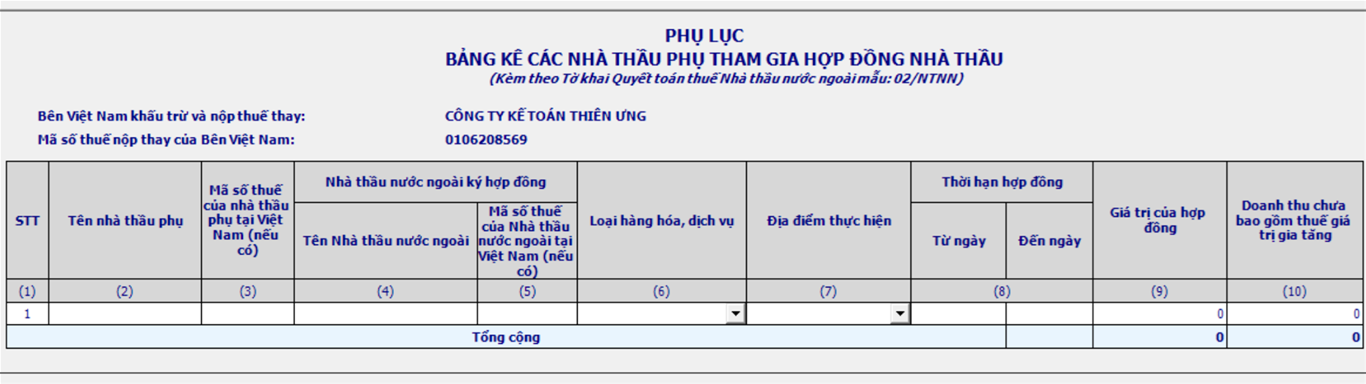 Mẫu phụ lục bảng kê các nhà thầu phụ tham gia hợp đồng nhà thầu trên phần mềm HTKK: