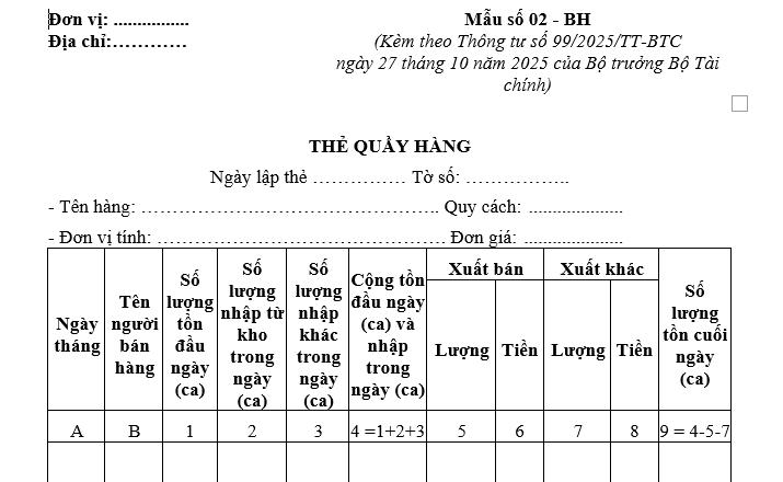 Thẻ quầy hàng – Mẫu số 02-BH theo Thông tư 99