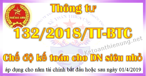 Ngày 28/12/2018 Bộ tài chính ban hành Thông tư 132/2018/TT-BTC Hướng dẫn Chế độ kế toán cho doanh nghiệp siêu nhỏ, có hiệu lực thi hành kể từ ngày 15/02/2019, áp dụng cho năm tài chính bắt đầu hoặc sau ngày 01/4/2019.
