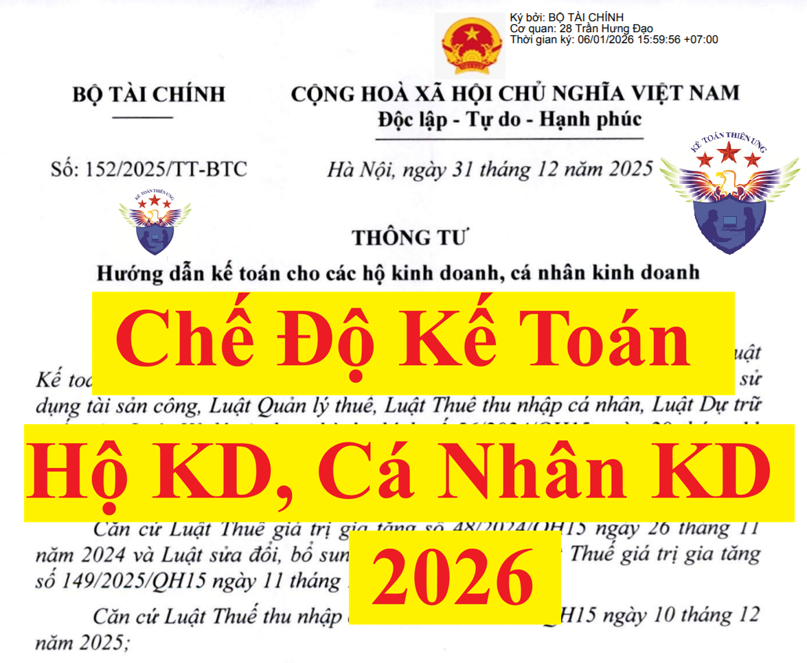 Ngày 31/12/2025, Bộ Tài chính đã ban hành Thông tư 152/2025/TT-BTC hướng dẫn chế độ kế toán của hộ kinh doanh, cá nhân kinh doanh.