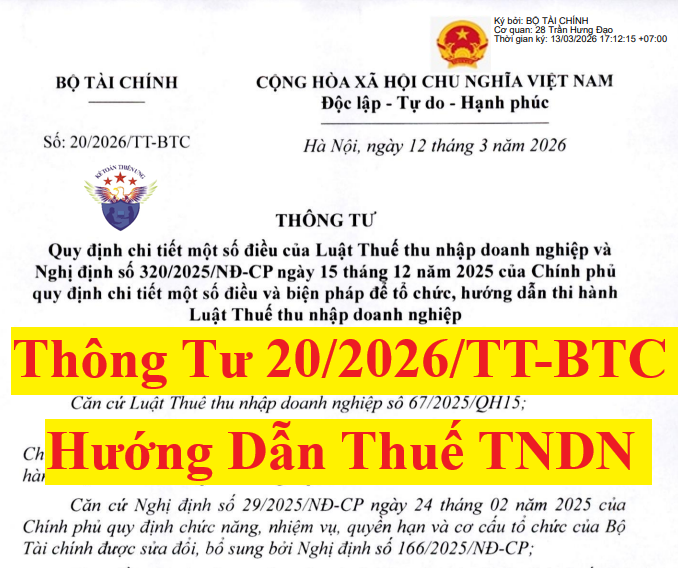 Ngày 12/3/2026, Bộ trưởng Bộ Tài chính ban hành Thông tư 20/2026/TT-BTC quy định chi tiết một số điều của Luật Thuế thu nhập doanh nghiệp và Nghị định 320/2025/NĐ-CP.