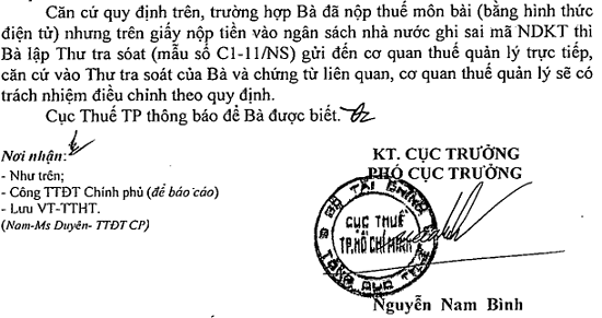 Trường hợp người nộp thuếphát hiện sai sót liên quan đến khoản nộp ngân sách nhà nước đã được cơ quan thuế hạch toán và thông báo, người nộp thuế lập thư tra soát (mẫu số C1-11/NS ban hành kèm theo Thông tư này) kèm theo chứng từ nộp thuế hoặc thông tin liên quan đến nội dung đề nghị điều chỉnh sai sót gửi cơ quan thuế.”